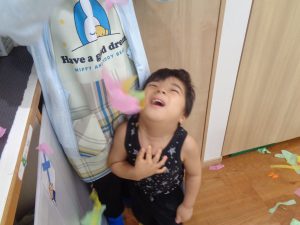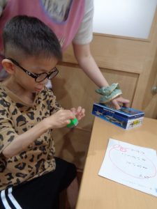 取り組む教材の枚数は固定せず、「スイカの時間(時計の文字盤横のイラスト)までできるよ」と時間で区切っています。5枚以上進める子もいれば、1枚をじっくり取り組む子もいます。「もうないのー?」と次々と取り組む意欲的な姿も見られています。その日の気分によることもあるので、1枚でも頑張ったことを褒め、「できた!」と思える経験を積み重ねていきます。