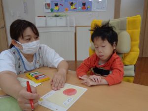 取り組む教材の枚数は固定せず、「スイカの時間(時計の文字盤横のイラスト)までできるよ」と時間で区切っています。5枚以上進める子もいれば、1枚をじっくり取り組む子もいます。「もうないのー?」と次々と取り組む意欲的な姿も見られています。その日の気分によることもあるので、1枚でも頑張ったことを褒め、「できた!」と思える経験を積み重ねていきます。