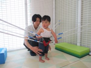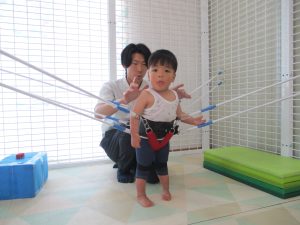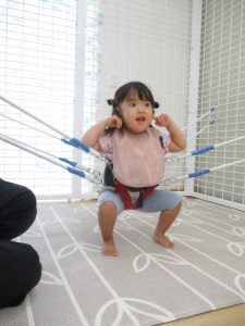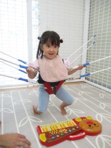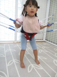 スパイダーシステム(ユニバーサルフレーム)とは、からだとフレームを複数のゴム紐でつないで、重力による負荷を減らし子どもたちが遊んだり立つ練習をする道具です。自力で立つのが難しい子どもたちが立ったり、ジャンプしたり今までできなかったことができるようになります。
